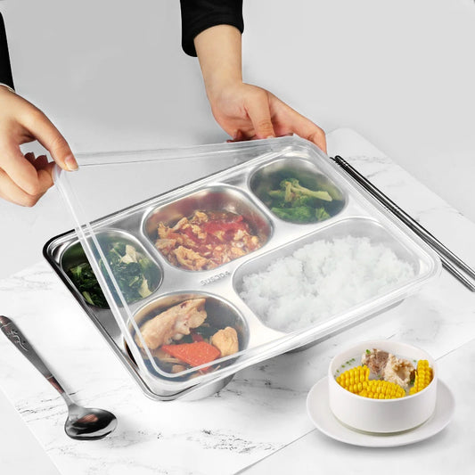 Stainless Steel Dinner Plate Divided Dinner Tray with Lid Food Storage Container Children School Canteen Tray Kitchen Tableware