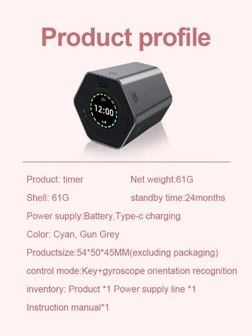 1.The timer has 5 preset times countdown(3/5/10/15/30 minutes) which are activated by flipping the timer over, with the number facing up. Additionally, you can easily set custom countdown time by pressing the buttons.
